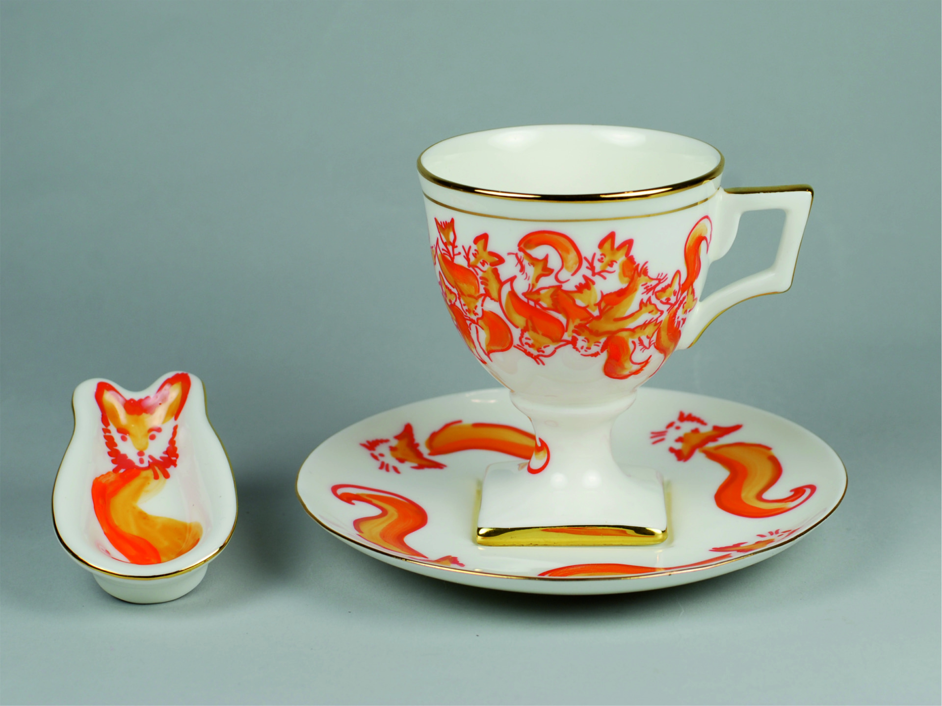 Znana współczesna artystka Pola Dwurnik przenosi swój charakterystyczny styl do porcelany, przekształcając lisy w delikatne kompozycje kwiatowe. Jej prace, ozdobione 24-karatowym płynnym złotem, ucieleśniają harmonijne połączenie nieokiełznanego piękna i wyrafinowanego luksusu.